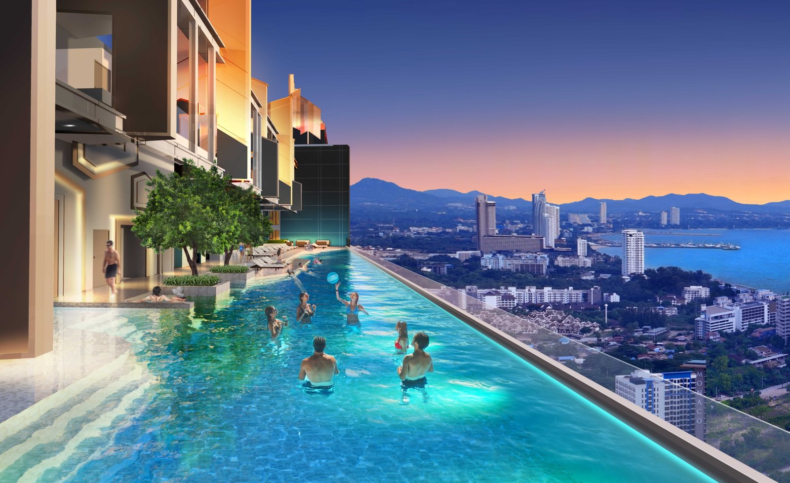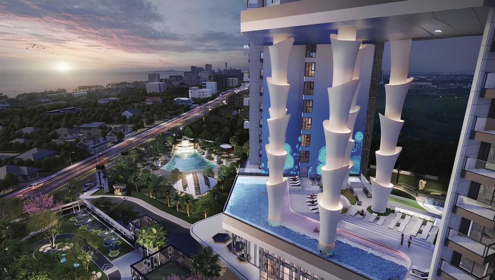 • Three unique sky pools for different leisure experiences: the scenic 30th-floor Jomtien Beach View Pool, the dramatic 40th-floor Large Cantilever Pool, and the exclusive 59th-floor 25m Rooftop Floating Lap Pool.